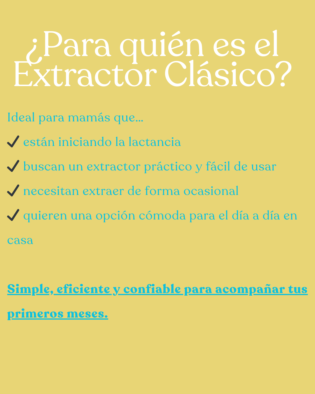 El Extractor de Leche CLÁSICO es una opción práctica, segura y eficiente para acompañarte en la extracción de leche materna de forma cómoda y controlada. Diseñado para respetar el ritmo natural de tu cuerpo, combina tecnología confiable, potencia regulable y facilidad de uso, ideal tanto para uso diario como ocasional.