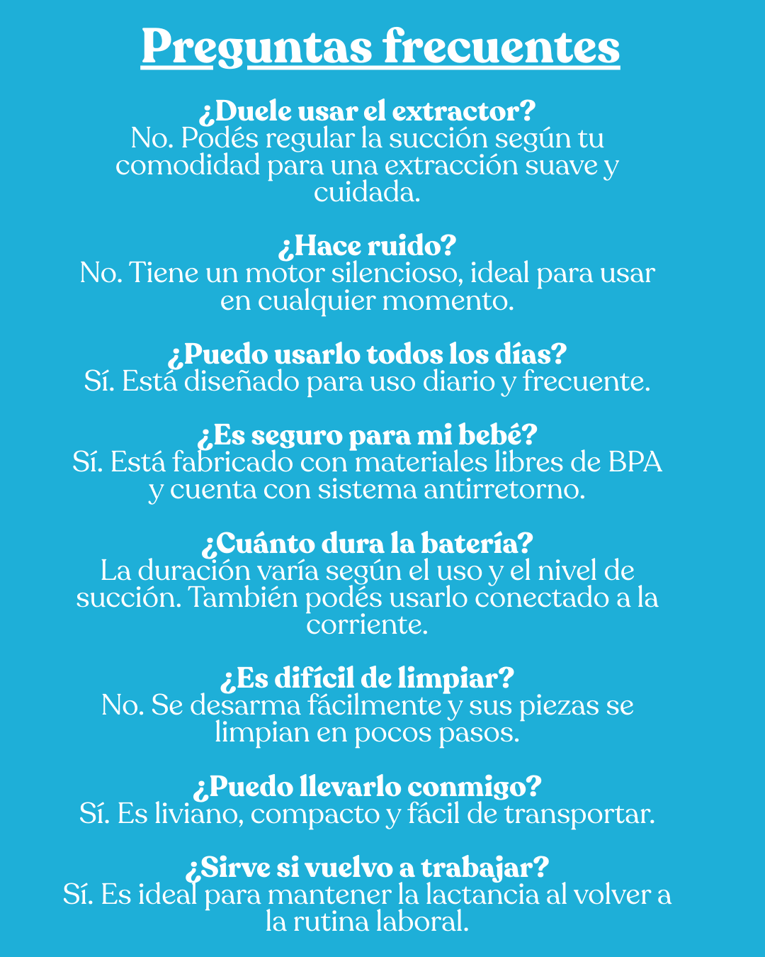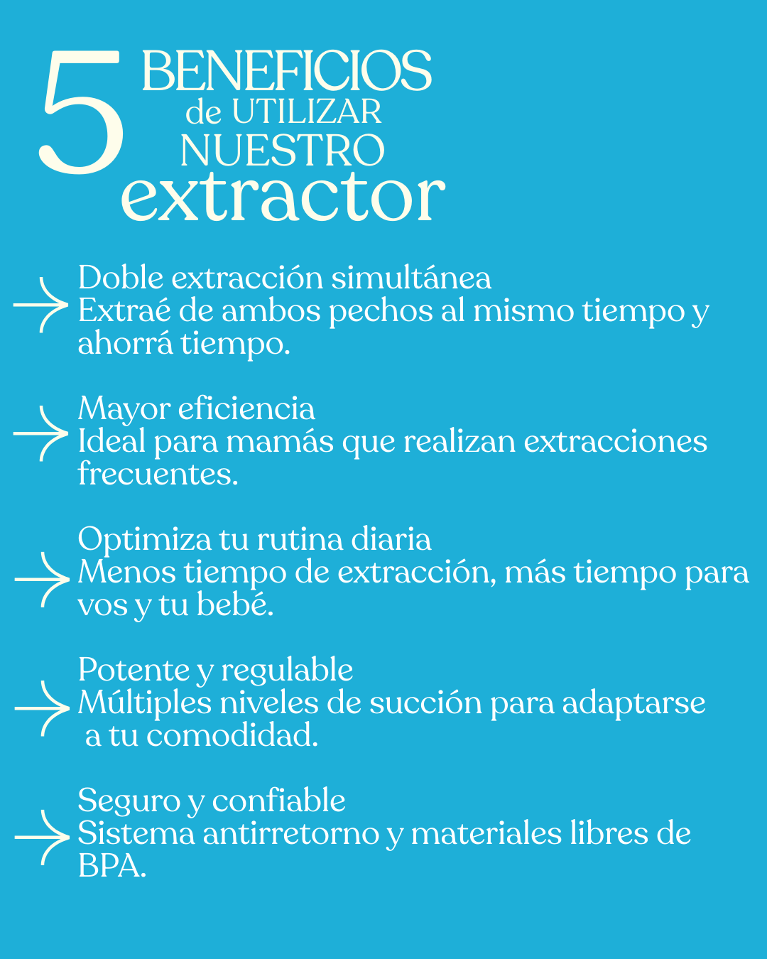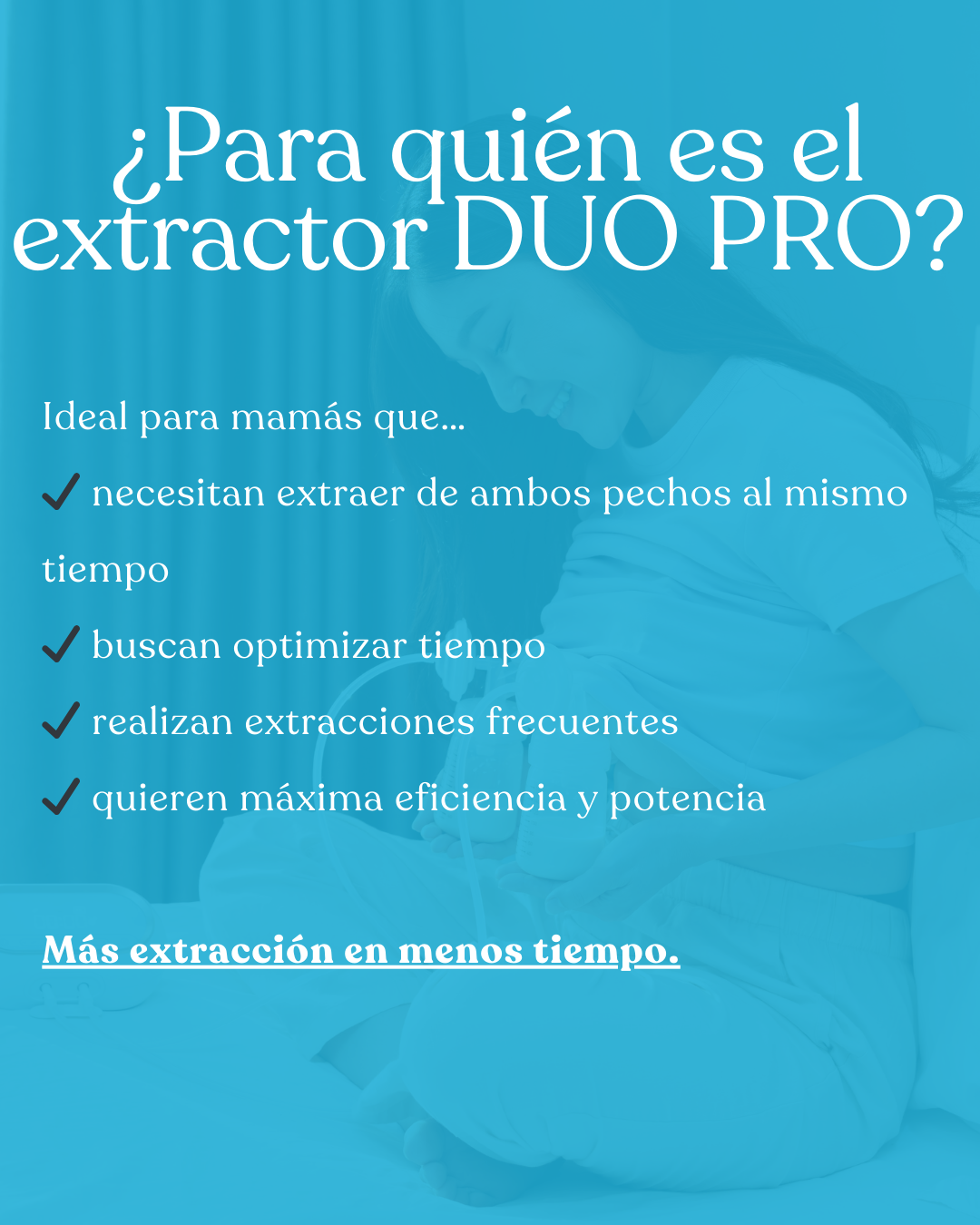El Extractor de Leche DUO-PRO está diseñado para mamás que necesitan optimizar tiempo sin resignar comodidad ni cuidado. Gracias a su sistema de doble extracción simultánea, permite extraer leche de ambos pechos al mismo tiempo, favoreciendo una producción más eficiente y reduciendo el tiempo total de cada sesión.